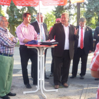 Am Bahnhof von Uffenheim soll der Bahnsteig erneuert werden. Eigentlich wäre von der Deutschen Bahn AG ein barierefreier Ausbau erst ab 1000 Fahrgästen täglich vorgesehen, doch in Uffenheim soll ein Modellprojekt realisiert werden. Mit dem sog. „Schweizer Model“ sollen die Bahngleise durch Rampen mit einer Steigung mit 10 bis 12% erschlossen werden. Der Unterschied zum deutschen Model ist, dass bei uns die Steigung lediglich 6 bis 7 % betragen darf. Die Inbetriebnahme ist für den Oktober 2016 geplant. Unser Ortsverein informierte bereits vor zwei Wochen über die geplante Maßnahme.(Siehe Bild mit Bundestagsabgeordneten Martin Burkert) Außerdem wurden der Stadt die Gärten gegenüber dem Bahnhof zum Kauf angeboten. Dort sollten weitere Park- and Ride- Parkplätze verwirklicht werden. Stadtrat Barz entgegnete, dass es im Bereich des Bahnhofs bereits genug versiegelte Flächen gäbe und man sich nach Alternativen erkundige solle.